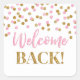 Bienvenidos pegatinas de regreso con un patrón de confeti dorado y rosado.