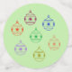 Saludos de vacaciones con corona y bolas ornamentales de árbol de Navidad. Una pieza grande tiene corona y "¡Feliz Navidad!" por un lado y siete ornamentos redondos al revés. Las piezas más pequeñas tienen adornos rojos, azules, verdes y violetas, con un colorido como complemento para el fondo.