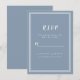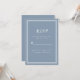 Tarjeta de confirmación de boda simple y elegante que presenta un diseño minimalista con un borde de doble marco en blanco crujiente sobre un fondo azul polvoriento de moda. Personalice con la fecha de su boda. Espacios provistos para que su invitado agregue sus nombres y respuestas para una respuesta de devolución. La letra y el guión están en blanco crujiente a juego. La parte trasera de la tarjeta es de azul polvoriento sólido a juego.