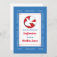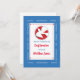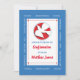 Una invitación de confirmación para tu hijo en azul y rojo. El Espíritu Santo, representado por una paloma blanca, está en el centro de un círculo sobre los detalles de la invitación. Personaliza con el nombre de tu hijo. Los regalos del Espíritu Santo están enmarcando la invitación. La parte posterior muestra todos los detalles del evento.