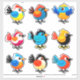 Una colección animada de doce pegatinas de pájaros estilo dibujos animados en colores brillantes. Ideal para manualidades infantiles, álbumes de recortes o decoración de aulas, que transmite amistad, diversión y encanto inspirado en la naturaleza.