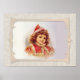 Niño victoriano con piel roja bonito, gorra y abrigo. Cara dulce y pelo marrón rizado. El fondo es un damasco de marfil suave. Ilustracion infantil vintage de Frances Brundage. Una encantadora colección de cosechas.
