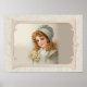 Niño victoriano con gorra verde flor de bonito. Cara dulce y pelo de quemadura rizada. El fondo es un damasco de marfil suave. Ilustracion infantil vintage de Frances Brundage. Una encantadora colección de cosechas.