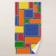 Este conjunto de toallas tiene un diseño Bauhaus de rectángulos formados con líneas grises y llenos de rojo, amarillo, naranja, azul y verde sobre un campo de negro.
