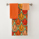 Este juego de toallas incluye un paño de lavabo naranja claro, una toalla de mano naranja y una toalla de baño con un diseño art decó de tulipanes de pentagones y trapezoides en diferentes tonalidades de naranja.
