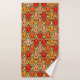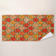 Este juego de toallas incluye un lavabo naranja, una toalla de mano naranja más oscura y una toalla de baño con un diseño art decó de tulipanes de pentagones y trapezoides en diferentes tonalidades de naranja.