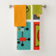 El conjunto de toallas incluye un lavabo verde, una toalla de mano dorada y una toalla de baño con un diseño moderno de mediados de siglo de un smorgasbord de gráficos modernos de colores retro.