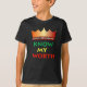 Camiseta infantil con las palabras "Conoce mi valor" en colores africanos, con una corona dorada en la parte superior. La parte trasera tiene un signo de dólar dorado.