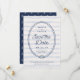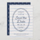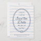 Anuncie a su boda a la familia y amigos con esta moda costera salven las tarjetas de cita en tonos de marina y azul claro. El diseño presenta un óvalo nudo de cuerda náutica con "guardar la fecha" y los detalles de su boda dentro. Un fondo ondulado a rayas azules completa el aspecto. Las tarjetas cambian a un patrón de anclas blancas en azul marino.