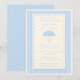 Esta invitación para una ducha de bebé 5x7 tiene fondo de rayas verticales azules. Hay un centro blanco con un paraguas donde está lloviendo corazones. Puede personalizar fácilmente la información de su fiesta aquí. Copyright © Diseños Zenware