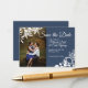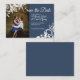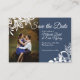 Patrón floral blanco enmarca tu foto en este gris azul ahorra la tarjeta de fecha. El sencillo diseño boda es versátil para aniversarios y cumpleaños, y es una hermosa manera de anunciar su fecha boda. El diseño decorativo del borde fotográfico puede transferirse a otros productos. Las obras de arte únicas están bellamente colocadas sobre tu foto de compromiso.