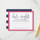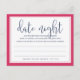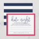 Dejen que las novias duchen a los invitados compartan sus ideas favoritas de la noche de citas para la pareja feliz, con estas dulces tarjetas. Moda y diseño de color rosa y marina precoz presentan "noche de cita" en letras modernas de caligrafía y un breve poema que instruye a los huéspedes sobre qué hacer. Personalizar con el nombre de la novia y la fecha de la ducha, y coloque una pila en la entrada del evento, párela o deje una en cada lugar. Hace un hermoso aguijón para la novia, y una gran alternativa al tarro de la noche de la cita!