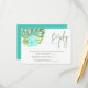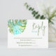 En esta tarjeta de respuesta, la hoja de monstera hawaiana, azul y verde es colorida. La tarjeta de inserción RSVP es una hermosa incorporación a las invitaciones nupciales marinas y tropicales. Versátil para los colores turquesa y azul boda.