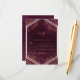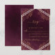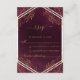 Elegante diseño de tarjeta RSVP con diseño de imitación de Relieve metalizado dorado con elementos botánicos sobre un fondo rojo oscuro con angustia y rayas geométricas.