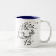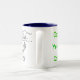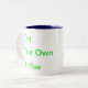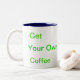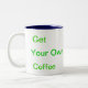 taza de café por encargo con el borde azul. Las palabras dicen que "consiga su propio café" en 1 lado de taza.