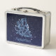 Caja de almuerzo con el símbolo de Aquarius en azul plateado suave, con las estrellas de la constelación, contra un fondo cielo estrellado de color azul oscuro a negro.