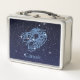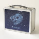 Caja de almuerzo con el símbolo de Cáncer en azul plateado suave, con las estrellas de la constelación, contra un fondo cielo estrellado clasificado de azul oscuro a negro.