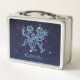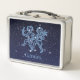 Caja de almuerzo con el símbolo de Gemini en azul plateado suave, con las estrellas de la constelación, contra un fondo de cielo estrellado clasificado de azul oscuro a negro.