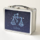 Caja de almuerzo con el símbolo de la libia en azul plateado suave, con las estrellas de la constelación, contra un fondo cielo estrellado de color azul oscuro a negro.