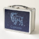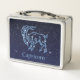 Fiambrera que ofrece el símbolo para el Capricornio en azul de plata suave, sobrepuesto con las estrellas de la constelación, contra un fondo estrellado del cielo calificado de azul de medianoche profundo para ennegrecerse.