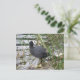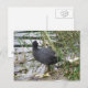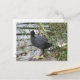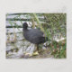 Esta postal muestra una fotografía de un Coot parado a orillas de un río. El pájaro es negro con un parche blanco en la cabeza. Tiene el cuello girado y está mirando sobre su hombro hacia la vegetación en la orilla del río.