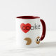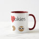 La taza de galletas de amor Met een rood hart. Afgebeeld staan 2 koekjes. 1 met 2 grote ogen en de andere die al voor een deel es opgegeten.