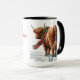 Este encantador tazón de café muestra una hermosa y detallada imagen de una vaca de la región de Highland. La vaca, con su largo abrigo tambaleante y sus distintivos cuernos curvados, se ve alejada, mirando hacia atrás sobre su hombro. La escena refleja la naturaleza gentil y curiosa de la vaca, en un entorno sencillo y rústico. El estilo de impresión negra le da un toque clásico y atemporal al diseño. Mensaje: La taza lleva el mensaje festivo: "¡Navidades locos!"