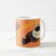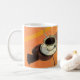 Imagen de ilustracion vintage con bebidas calientes y bebidas con una taza retro de café sobre un mantel naranja.