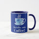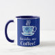 La taza de café estilizada está llena de un patrón floral azul y coronada con vapor ascendente. Debajo, la frase "¡menos café, más café!" agrega un toque humorístico y relativo perfecto para los amantes del café.