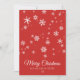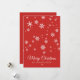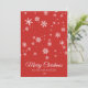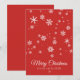 Tarjeta de vacaciones de Navidad elegante y moderna. La tarjeta con un texto de Feliz Navidad, su nota personal y un número de año en escritura blanca de moda. Los hermosos copos de nieve blancos superpuestos están en el lado frontal de la tarjeta - el fondo es rojo. Personalice fácilmente esta tarjeta con su nombre y un número de año. Es un gran diseño para familias, parejas y personas solteras.