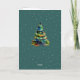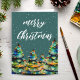 Tarjeta de vacaciones de copos de nieve del árbol de Navidad en acuarela verde. Árbol de Navidad colorido en acuarela sobre fondo verde oscuro con copos de nieve. Puede agregar su propio mensaje dentro de la tarjeta o borrarlo.