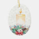 Arco rojo festivo, una vela de color amarillo acuático, bayas huecas, ramas de abeto y flores blancas sobre fondo de copos de nieve blancos