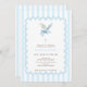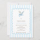Un diseño de invitación al bautismo dulce con una paloma acuarela, borde de vieiras y franjas azules suaves. Perfecto para celebrar el bautismo o el bautizo de su bebé con la familia y amigos. Se incluyen detalles del personalizable.