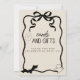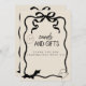 Agregue un toque de elegancia a su mesa de regalos con nuestra Señal de Mesa de Tarjetas y Regalos A Little Boo. Con un elegante lazo coquette negro con fantasmas/murciélagos y las palabras "Tarjetas y Regalos" junto con "Gracias por Celebrar con Nosotros", esta señal de mesa es una forma encantadora de guiar a sus invitados.