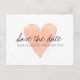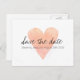 El corazón de la acuarela rosa coral salva las postales de fecha para el boda. Símbolo vintage de amor capeado con texto de guión elegante para nombres de novias y novios más fecha. Diseño romántico de ilustracion personalizado con tu mensaje para los huéspedes. Color del fondo del personalizable es blanco. Impresión rústica de la moda del país para fiesta matrimonial elegante. Pintura de color de agua dibujada a mano.