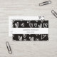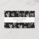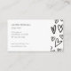 Destacar con tarjeta de visita artística para el corazón con corazones de patrón sin fisuras dibujados a mano sobre un fondo negro con rectángulo blanco en el medio sosteniendo un monograma con letra minimalista moderna. En la parte trasera está alineada toda la información personal con el mismo tipo de letra a la izquierda con los corazones negros en el borde de fondo blanco a la derecha.