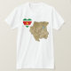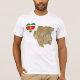 Una bandera surinamesa en forma de corazón se coloca al lado de un mapa de relieve de Surinam en esta camiseta distintivamente patriótica.