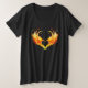 Ángel dispara el corazón con las alas flameantes sobre fondo negro.
