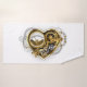 Corazón mecánico, volumétrico, de vapor punk con manómetro de presión, acero y engranajes dorados sobre fondo blanco. Estilo Steampunk.