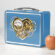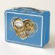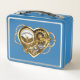 Corazón mecánico, volumétrico, de vapor punk con manómetro de presión, acero y engranajes dorados sobre fondo blanco. Estilo Steampunk.