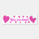 Los corazones rosados, dos más grandes en los extremos, y nueve más pequeños encima y debajo del texto, Te encantan, están impresos en pegatinas de parachoques. El texto también es rosa y el fondo es blanco. Gracias por comprar en PositiveAffirmation en Zazzle.