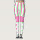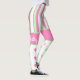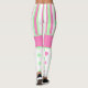 leggings rosas, verdes y blancas, con gráficos de grandes corazones, en la parte inferior de las leggings y rayas, en la mitad superior. Una gran banda rosa, que atraviesa el área de la rodilla, tiene texto blanco personalizado listo para personalizar. Ideal para hacer ejercicio y correr por la ciudad.