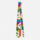 Esta corbata tiene un diseño de cuadrados hechos de rectángulos en brillantes colores de los años 70 con signos de paz dispersos alrededor de ella.