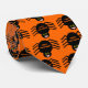 Esta linda corbata de Halloween muestra una espeluznante corbata con muchas arañas negras con ocho piernas peludas, ojos amarillos con grandes pupilas negras y sus bocas abiertas mostrando sus colmillos. La corbata es naranja y hay un texto naranja en la parte trasera de todas las arañas que dice "Halloween feliz".
