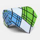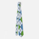 Esta corbata tiene un diseño art deco de formas diamantíferas hechas de ángulos superpuestos en líneas negras coloreadas en tonos azules y verdes con líneas negras diagonales que hacen que el diseño se parezca a un argyle