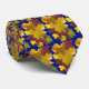 Una elegante corbata con un diseño de coloridas hojas de otoño sobre un fondo azul profundo.