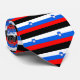 La bandera nacional de Eslovenia tiene tres bandas horizontales iguales de blanco (arriba), azul y rojo, con el escudo esloveno de armas situado en la parte superior de la bandera centrada en las bandas blanco y azul. El escudo de armas es un escudo con la imagen del Monte Triglav, el pico más alto de Eslovenia, en blanco contra un fondo azul en el centro; debajo hay dos líneas azules onduladas que representan el mar Adriático y los ríos locales, y encima hay tres estrellas doradas de seis puntas dispuestas en un triángulo invertido que son tomadas del escudo de armas de los condes de Celje, la gran casa dinástica eslovena de finales del siglo XIV y principios del siglo XV.