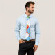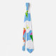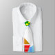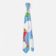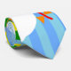 Esta corbata tiene un diseño geométrico de cometas volando en las nubes de un cielo rayado azul. Es muy colorido y festivo.