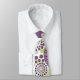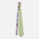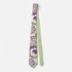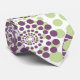 Esta corbata tiene un diseño de círculos decorados con líneas y círculos hechos de puntos repetitivos en berenjenas y verde.
