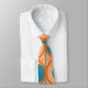 Este empate tiene un diseño moderno de mediados de siglo de círculos naranjas abiertos con círculos verde azulados sólidos que atraviesan el patrón con líneas verticales verde azuladas y líneas horizontales naranjas.